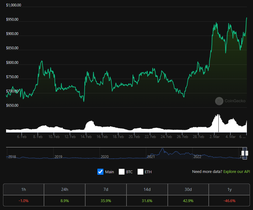 Tại thời điểm BeInCrypto viết bài này, giá MKR ghi nhận mức tăng 8.9% trong 24 giờ qua, nâng mức tăng trong 30 ngày qua lên gần 43%. 1 MKR hiện có giá 959.05 USD. Phân tích on-chain MKR cho chúng ta thấy động thái tăng này dường như đến từ hành động tích lũy của một cá voi trên thị trường. Cụ thể: