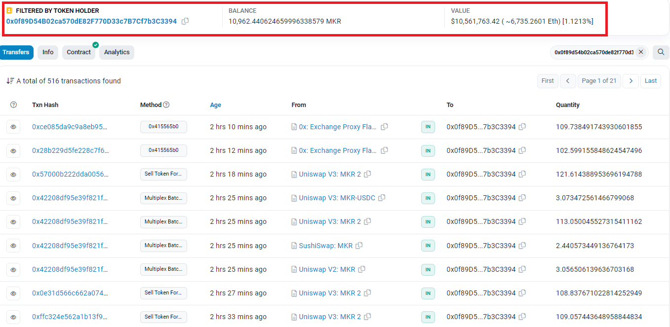 - Sau đó nó vẫn tiếp tục mua thêm. Và tại thời điểm BeInCrypto thực hiện bài viết, ví này hiện nắm giữ khoảng 10,962 MKR token, trị giá khoảng 10.56 triệu USD.
