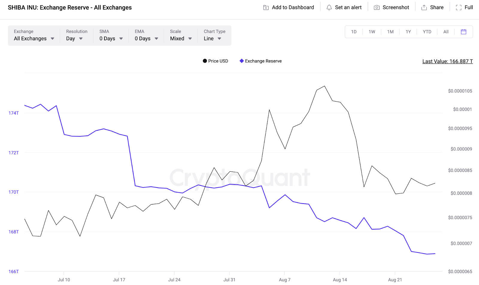 Exchange Reserves theo dõi những thay đổi theo thời gian thực trong tổng số dư SHIB mà các nhà đầu tư nắm giữ trong ví của các sàn giao dịch tiền điện tử. Biểu đồ trên cho thấy xu hướng tăng giá Shiba Inu gần đây vào ngày 05/8 và ngày 12/8 dẫn đến sự sụt giảm đáng kể của chỉ số này.