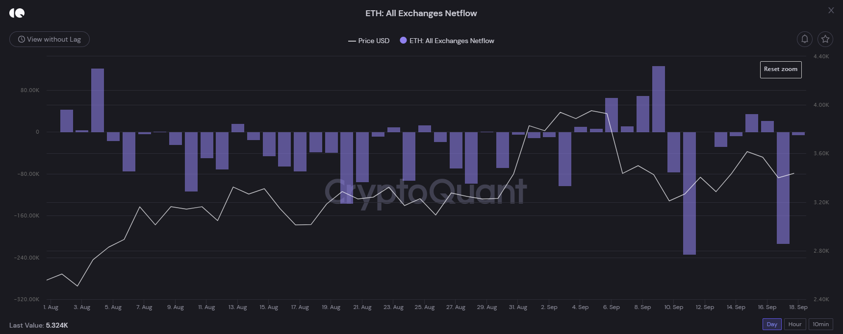 Tuần vừa qua chúng ta chứng kiến có một lượng lớn ETH rời khỏi các sàn giao dịch. Theo thống kê từ CryptoQuant, có tới 253,117 ETH được rút ra khỏi các sàn giao dịch. Ngược lại, chúng ta chỉ thấy có 56,260 ETH được nạp lên các sàn giao dịch.