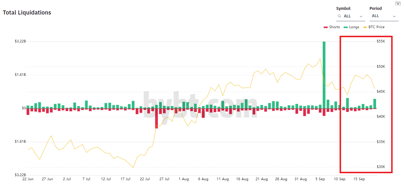 Tỷ lệ các lệnh long bị thanh lý trong tuần vừa rồi chiếm ưu thế hơn hẳn. Chỉ tính riêng trong ngày 19/9, số lượng các lệnh long bị thanh lý đã lên tới khoảng 459.06 triệu USD.
