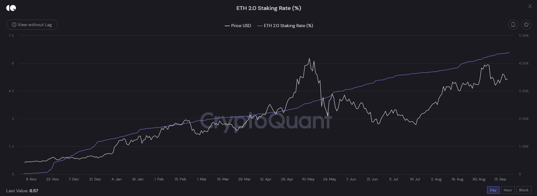 Tính đến thời điểm hiện tại, Ethereum 2.0 cũng đã trải qua một chặng đường phát triển khá dài. Hãy cùng nhìn lại Ethereum 2.0 ở thời điểm hiện tại xem có gì khác biệt nhé. Hình dưới đây cho ta thấy tỷ lệ tương quan giữa lượng ETH được staking và giá cả của nó.