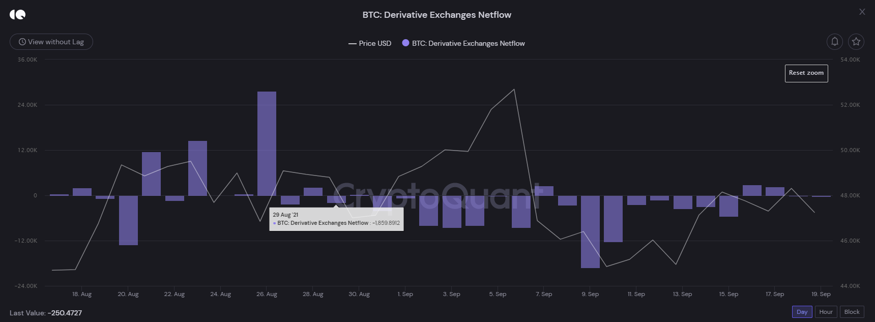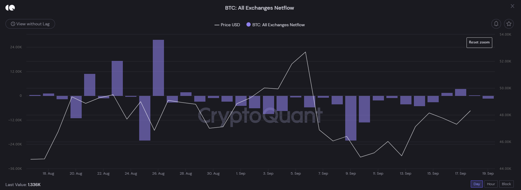 Trong đó, phần lớn lượng Bitcoin được đưa ra ngoài sàn giao dịch vào các ngày 13, 14 và 15 tháng 9. Ba ngày 16, 17 và 18 có thêm Bitcoin nạp lên trên sàn nhưng với số lượng không nhiều. Như vậy, số lượng Bitcoin này hoặc là đi về ví trữ lạnh của các NĐT. Hoặc là được dùng làm tài sản thế chấp trên các sàn giao dịch phái sinh.