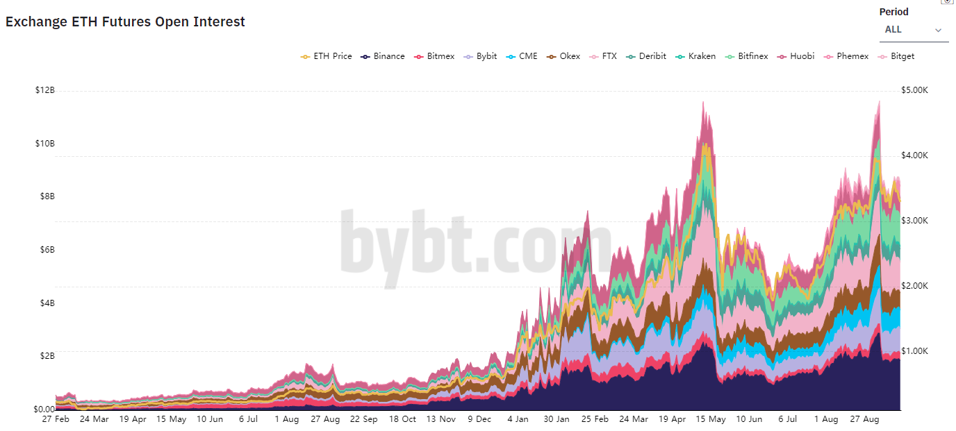 Hiện tại, chỉ số OI trên Binance, bybit và CME đang cao nhất thị trường. Mức hiện tại đang ngang bằng với thời điểm đầu tháng 8/2021. Đầu tháng 8, sự gia tăng tỷ lệ OI cũng diễn ra đồng thời với quá trình phục hồi giá của đồng ETH.