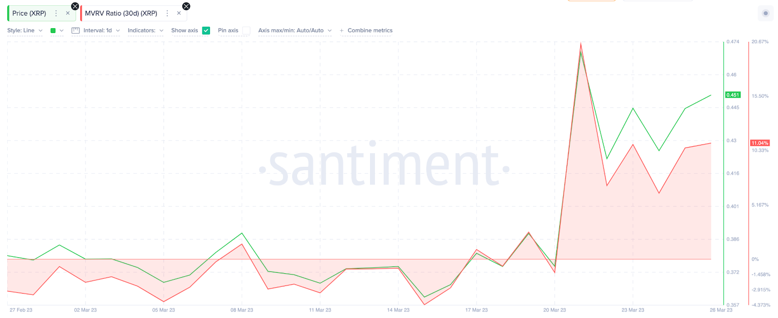 Ngoài ra, những thông báo tích cực gần đây của Ripple đã khiến tâm lý nhà đầu tư XRP trở nên khá phấn khích. Theo Santiment, XRP gần đây đã vươn lên dẫn đầu bảng xu hướng trên các kênh truyền thông tiền điện tử khác nhau. Như được mô tả bằng đường màu đỏ bên dưới, sự thống trị xã hội của XRP đã tăng gần gấp đôi trong khoảng thời gian từ ngày 13/3 đến ngày 27/3, từ 0.94% lên 1.78%.
