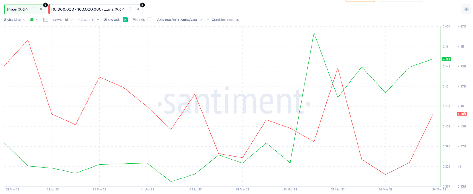 Trong bối cảnh thị trường phản ứng tích cực, việc bán tháo của cá voi XRP, cùng với các số liệu on-chain khác, cho thấy một đợt điều chỉnh giá sắp xảy ra. Theo Santiment, một nhóm cá voi đã bán gần 140 triệu USD tiền XRP trong hai tuần qua. Cụ thể phân tích on-chain XRP cho thấy từ ngày 09/3 đến ngày 27/3, nhóm này đã bán hơn 300 triệu XRP, trị giá khoảng 141 triệu USD.