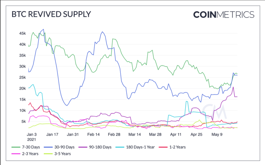 CoinMetrics đã lưu ý một thông tin đáng chú ý trong báo cáo ngày 25 tháng 5. Với các đơn vị Bitcoin có thời gian lưu giữ từ 90 đến 180 ngày.