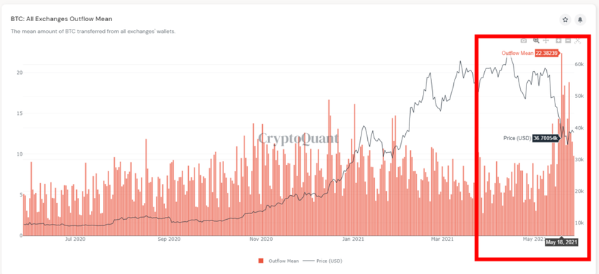 Trên thực tế, biểu đồ cũng cho thấy mức trung bình BTC rời khỏi các sàn giao dịch đang đạt mức kỷ lục. Trong trường hợp này, lượng Bitcoin trung bình được khai thác từ các sàn giao dịch đạt con số 22.38 BTC.