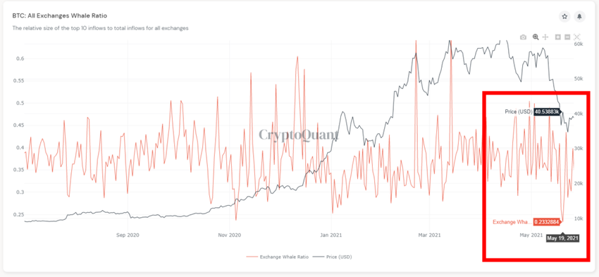 Biểu đồ mô tả thị phần cá voi trên các sàn giao dịch đạt mức thấp nhất chưa từng thấy kể từ tháng 11 năm 2020.