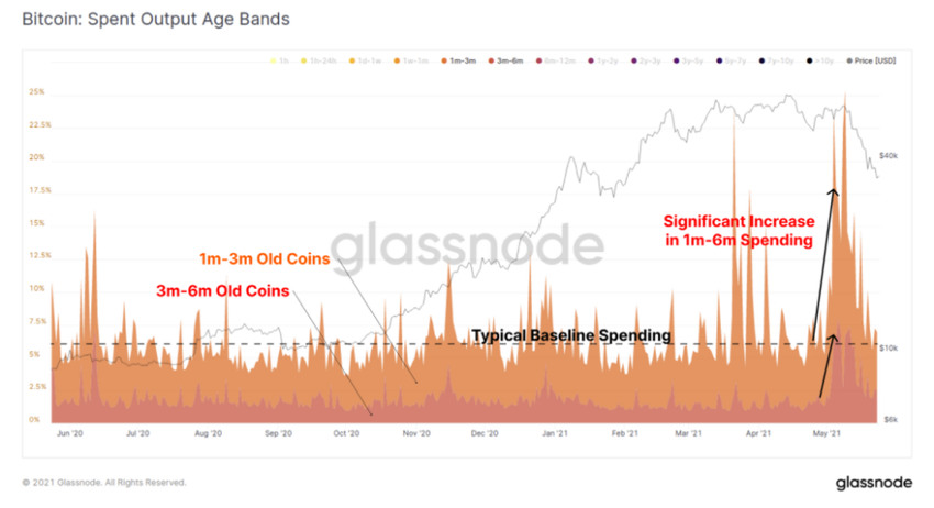 Dựa theo thông tin báo cáo tuần 21 năm 2021 của Glassnode tiết lộ. Với những BTC có từ 1 lên đến 6 tháng được lưu giữ trong ví. Chúng đã kịp thực hiện một chuyển động đạt đỉnh ngay trước khi giảm mạnh.