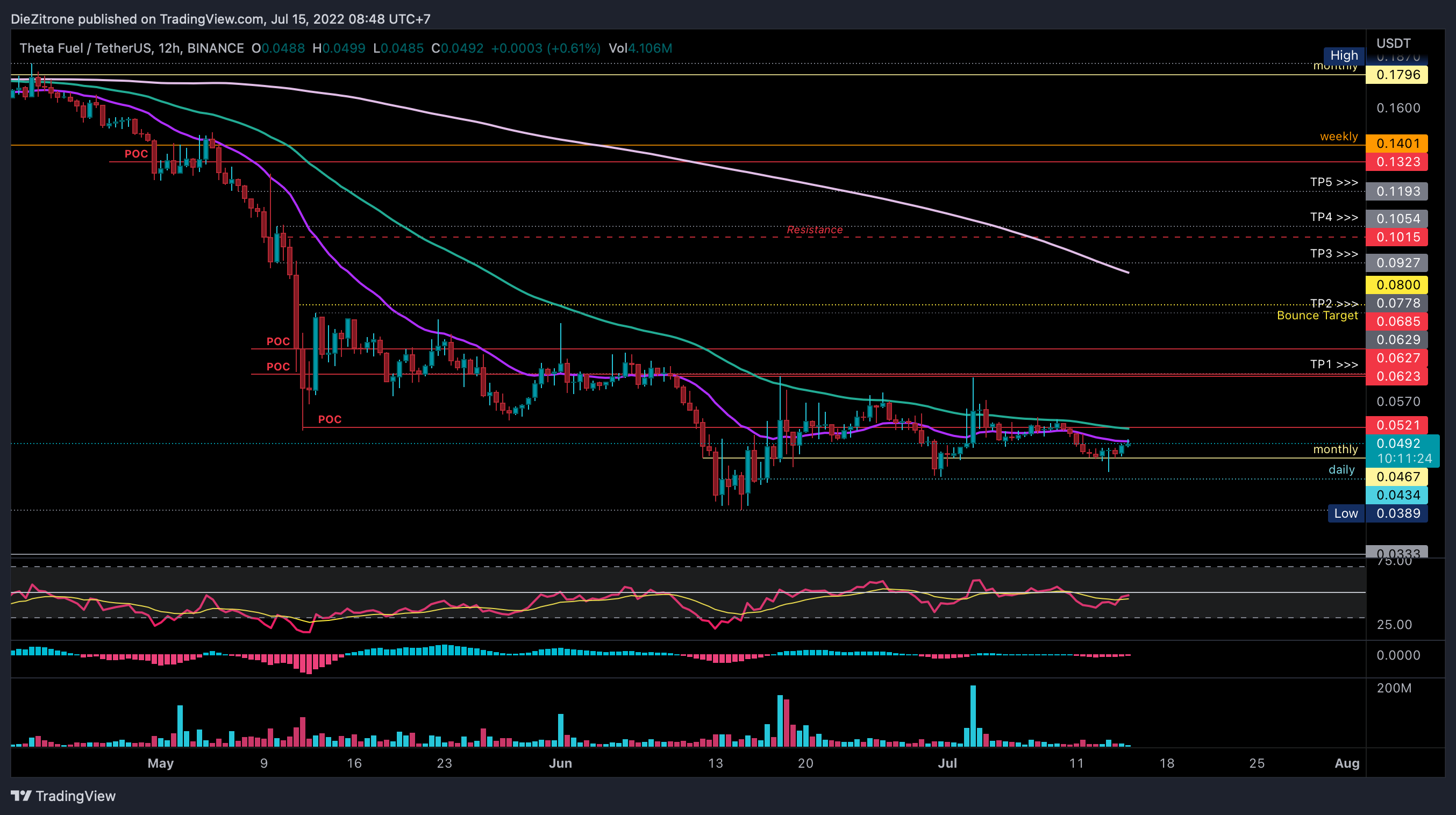 Nhà giao dịch tiền điện tử @Pure8Nature đã tweet một biểu đồ của TFUEL. Đoạn tweet đề cập rằng giá có thể sớm tăng lên trên 5 USD. Quan sát biểu đồ, chúng ta dễ dàng thấy giá TFUEL hoạt động ở vùng dưới của ba đường trung bình động dài hạn. Thông thường, đây là tín hiệu tích lũy dự kiến tạo một biến động tăng giá.