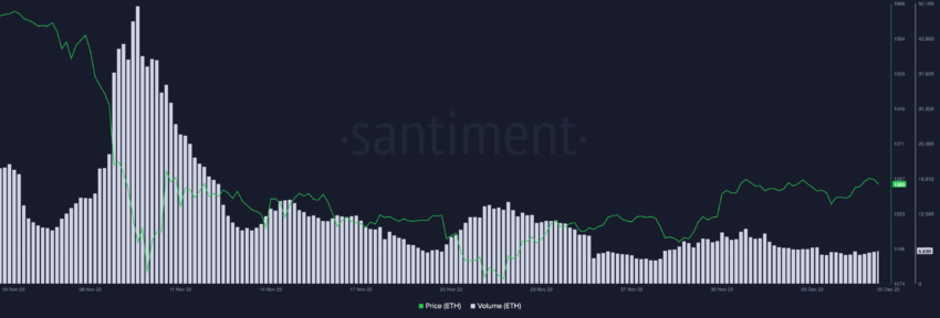 Tuy nhiên, khi xem xét khối lượng giao dịch của ETH cho thấy thị trường có mức độ biến động thấp hơn. Khối lượng đã tạo ra các đỉnh thấp hơn và tiếp tục đi ngang. Điều này có nghĩa là phe bò Ethereum có thể gặp khó khăn khi đẩy hành động giá tiến lên.