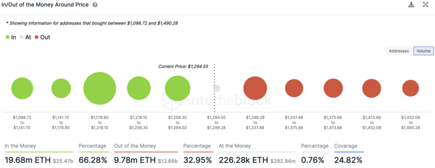 Theo IntoTheBlock, chỉ báo In/Out of the money around the price (dòng tiền vào/ra quanh mức giá) cho thấy rằng một rào cản đáng kể cho giá ETH nằm ở mức 1,317 USD. Tại đây có 1.82 triệu địa chỉ nắm giữ 3.33 ETH.