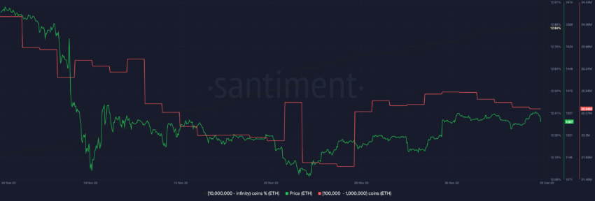 Các biến động từ cá voi Ethereum thường nhấn mạnh hơn về hành động giá. Trong một tháng qua, nhóm cá voi tương quan với giá nhất nắm giữ 100,000 ETH – 1,000,000 ETH đã giảm lượng nắm giữ của họ hơn 2 triệu ETH.