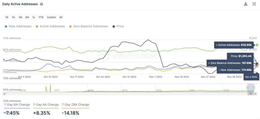 Nhìn vào các địa chỉ lưu trữ ETH hoạt động hàng ngày cho thấy các địa chỉ mới trong 7 ngày đã giảm 7.45%. Mặc dù các địa chỉ đang hoạt động đã tăng hơn 8%, nhưng việc giảm địa chỉ mới cho thấy có ít người mới tham gia vào mạng hơn.