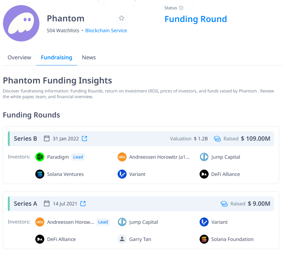 Dữ liệu CryptoRank cho biết, ví Phantom đã huy động được tổng cộng 118 triệu USD trong hai vòng gọi vốn Series A và Series B trong giai đoạn 2021 – 2022. Trong hai năm trở lại đây, dự án không nhận thêm khoản đầu tư mới nào. Có thể thấy các VC tham gia đầu tư Phamtom đều là những VC hàng đầu thị trường, như Paradigm, a16z, Jump Capital, Solana Venture…