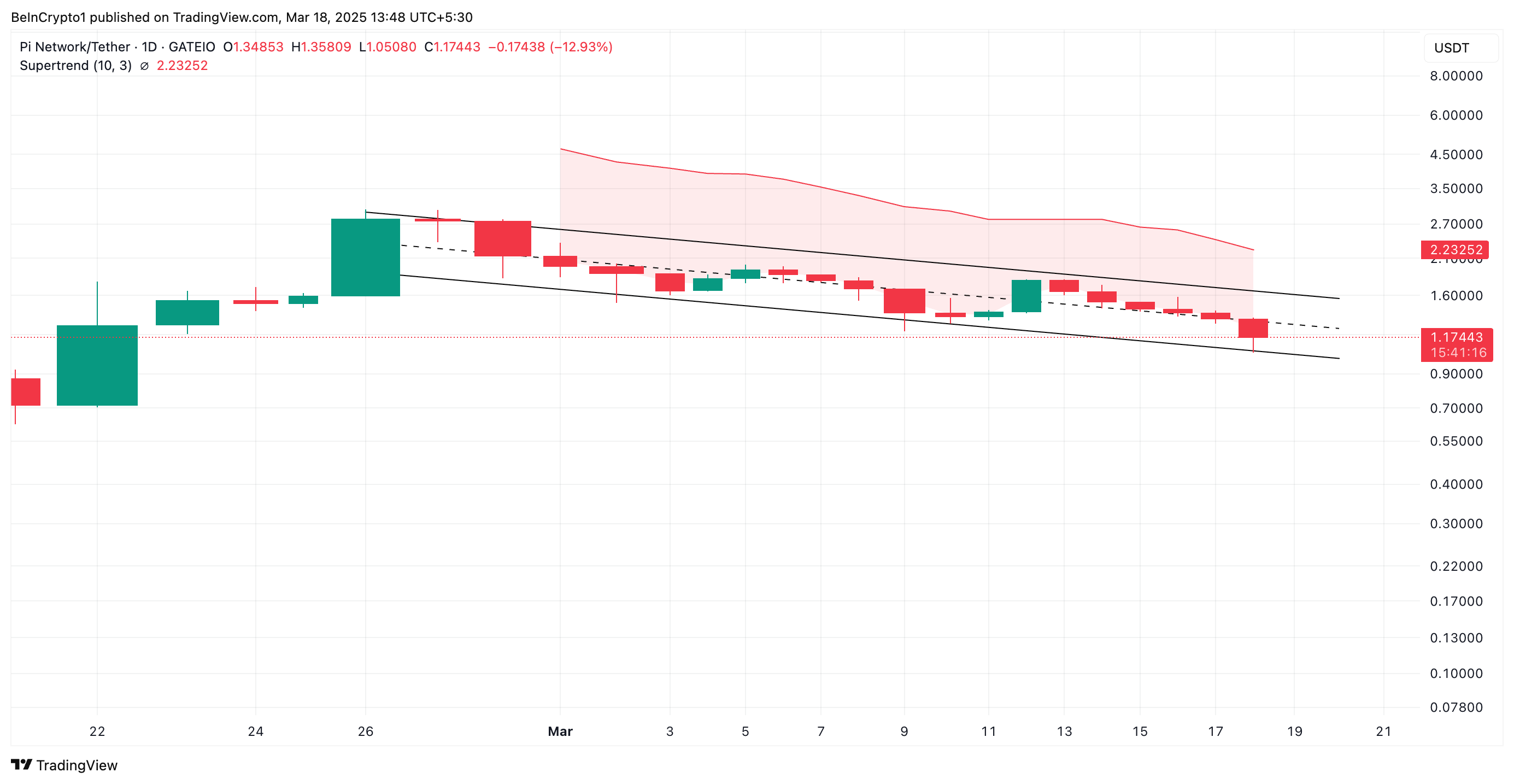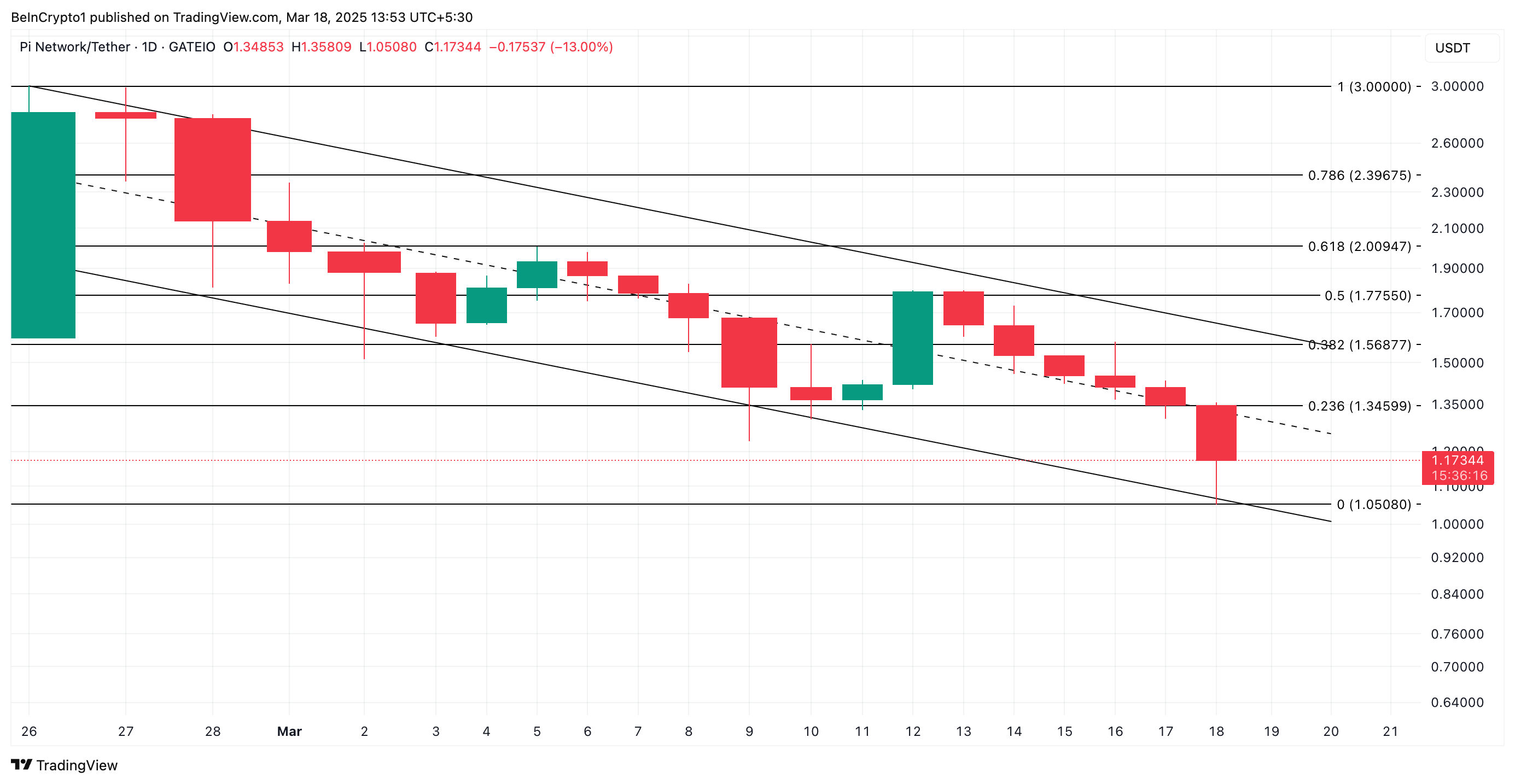 PI có nguy cơ giảm thêm nếu áp lực bán tăng mạnh hơn. Trong kịch bản này, altcoin có thể giảm về mức 1.05 USD trong nỗ lực phá vỡ dưới kênh song song giảm dần của nó.