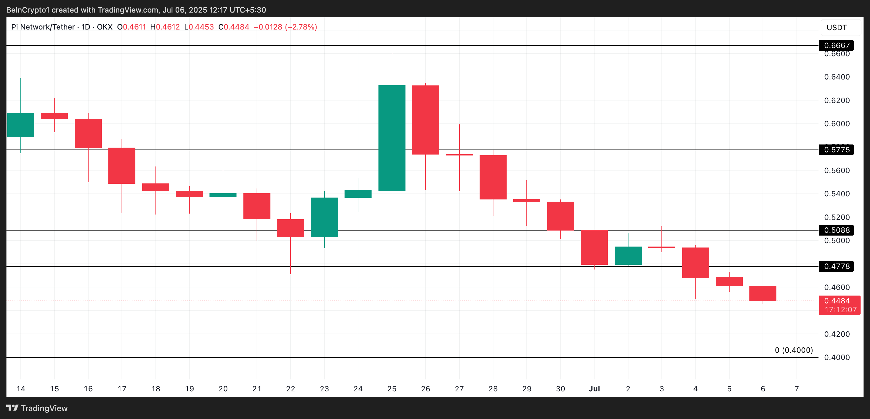 Biểu đồ hàng ngày của PI/USD cho thấy altcoin này đã có giai đoạn tích lũy ngắn từ ngày 01/07 đến 04/07, đối mặt với kháng cự tại 0.50 USD và hỗ trợ tại 0.47 USD.
