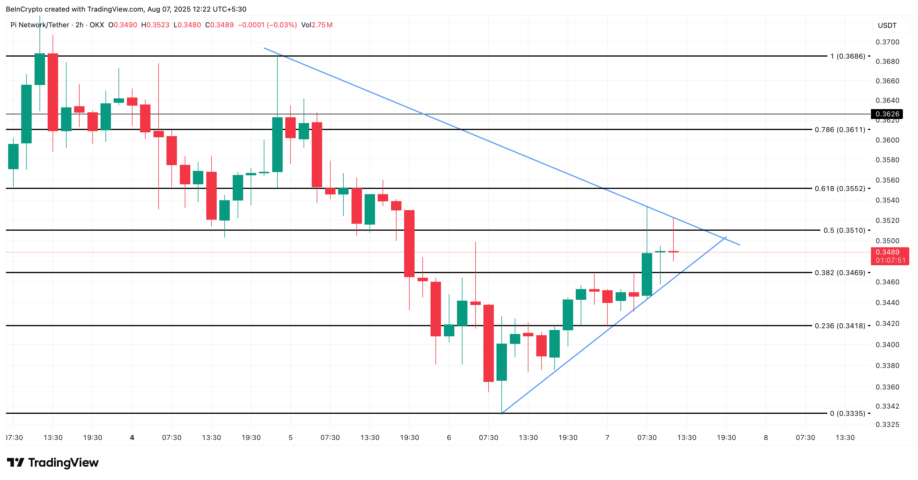 Trên cùng biểu đồ 2 giờ, giá PI cũng đang áp sát đường xu hướng trên của một cờ tăng giá, tích lũy chặt chẽ gần 0.35 USD. Một cây nến đóng cửa rõ ràng trên mức đó có thể mở ra một đợt tăng ngắn hạn, với các mục tiêu ngắn hạn gần 0.36 USD.