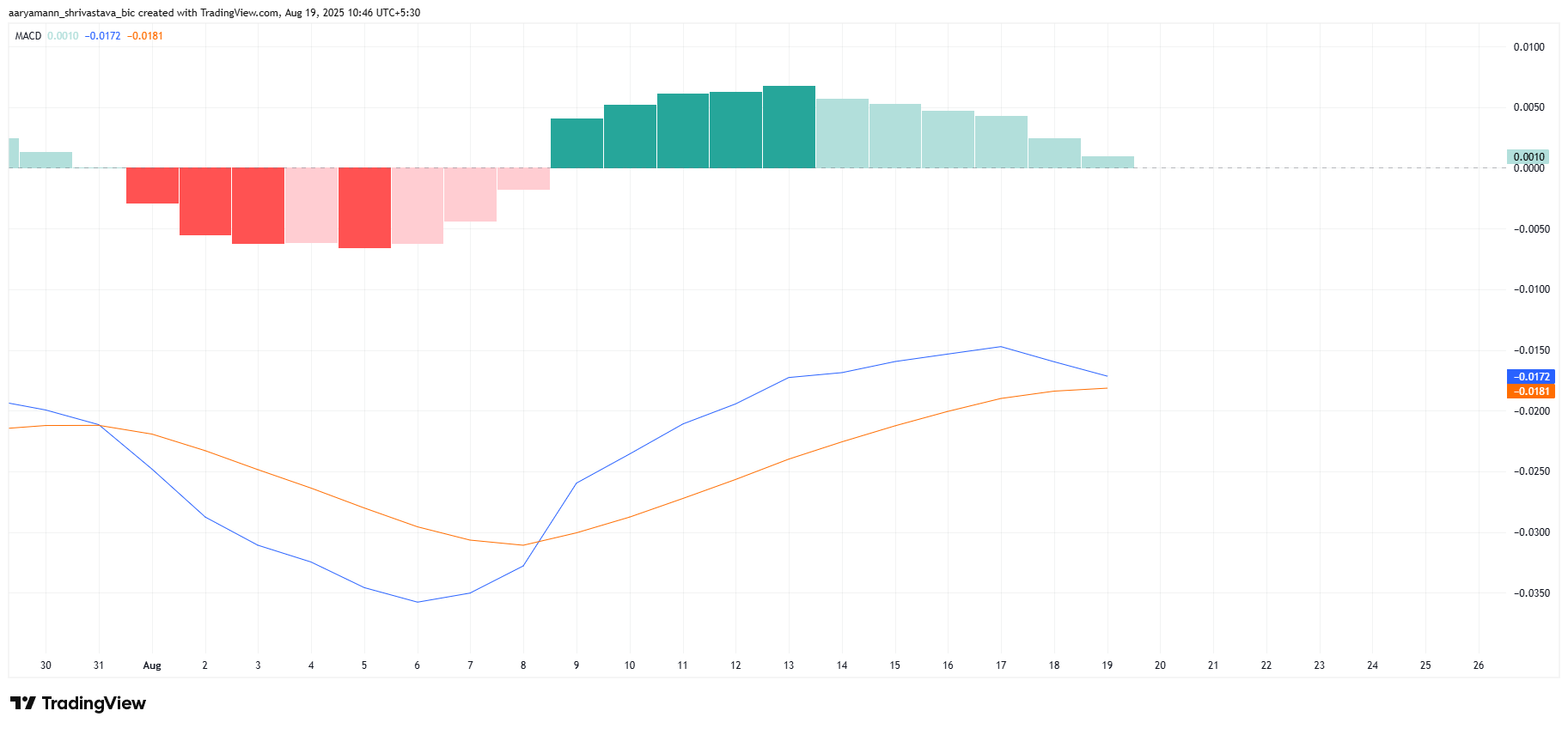 Động lực vĩ mô của Pi Coin cũng đang báo hiệu sự chuyển hướng sang xu hướng giảm. Chỉ báo Moving Average Convergence Divergence (MACD) đang tiến gần đến giao cắt giảm giá, với đường tín hiệu đang tiến gần đến việc cắt qua đường MACD.