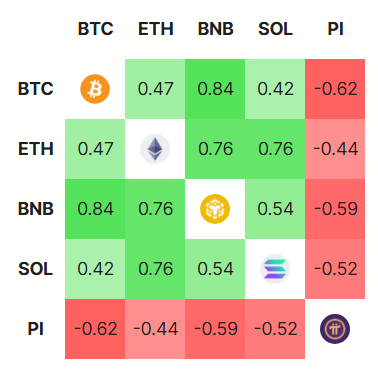 Thứ ba, hành vi thị trường của Pi Network đang tách rời khỏi đợt tăng giá tiền điện tử rộng lớn hơn. Dữ liệu từ DeFiLlama cho thấy trong khi Bitcoin, Ethereum và Solana duy trì mối tương quan tích cực cao—di chuyển cùng nhau khi tâm lý nhà đầu tư thúc đẩy lợi nhuận—Pi Network lại thể hiện mối tương quan tiêu cực. Sự khác biệt này cho thấy PI đang di chuyển ngược lại với sự lạc quan hiện tại của mùa altcoin.