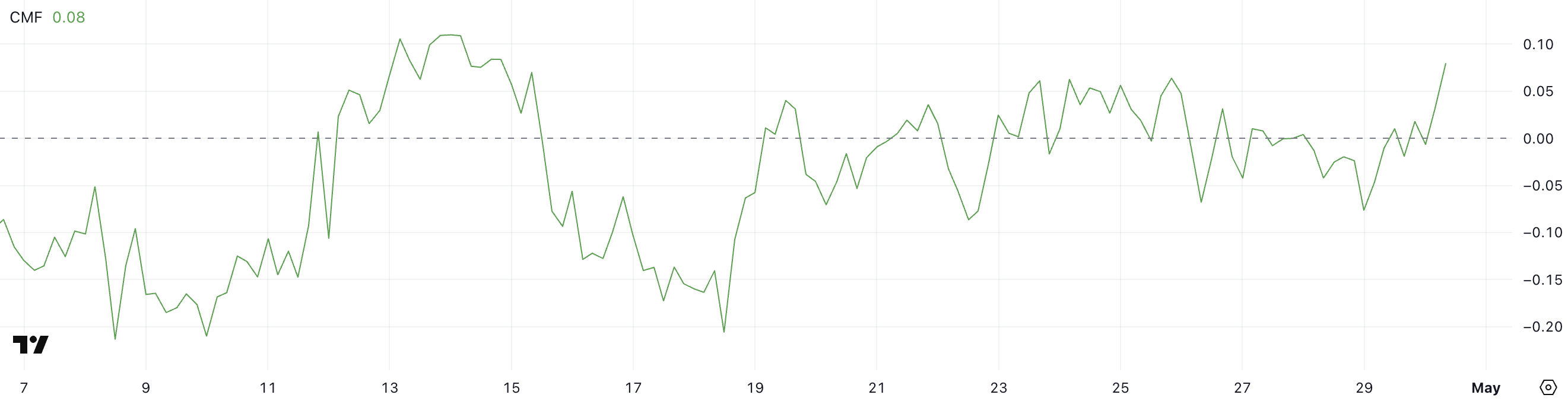 CMF là một chỉ báo dựa trên khối lượng đo lường dòng tiền vào hoặc ra khỏi một tài sản trong một khoảng thời gian nhất định. Nó dao động từ -1 đến +1, với các giá trị trên 0 chỉ ra áp lực mua (tích lũy) và các giá trị dưới 0 báo hiệu áp lực bán (phân phối).