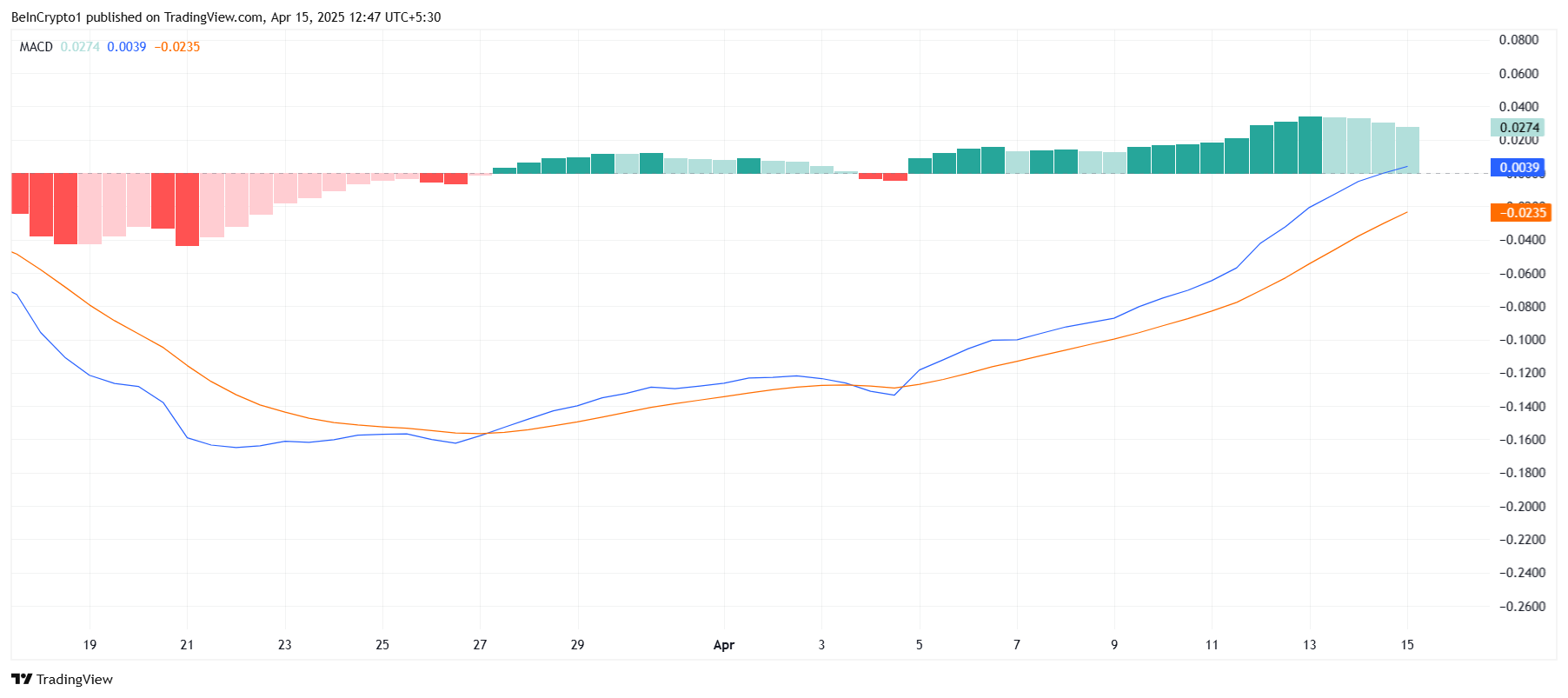 Chỉ báo Moving Average Convergence Divergence (MACD) cho thấy rằng mặc dù động lực tăng của Pi Network đang bắt đầu suy yếu, nhưng chưa đảo chiều. Chỉ báo này vẫn nằm trong vùng tích cực, cho thấy vẫn còn tiềm năng cho sự tăng trưởng tiếp tục. MACD còn xa mới có sự giao cắt giảm giá, điều này có thể cho thấy Pi vẫn còn không gian để tăng trong ngắn hạn.
