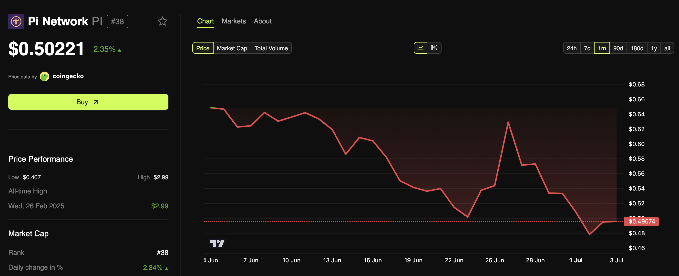 Sự phát triển này đi kèm với sự phục hồi giá nhẹ của token gốc của Pi Network, Pi Coin (PI).