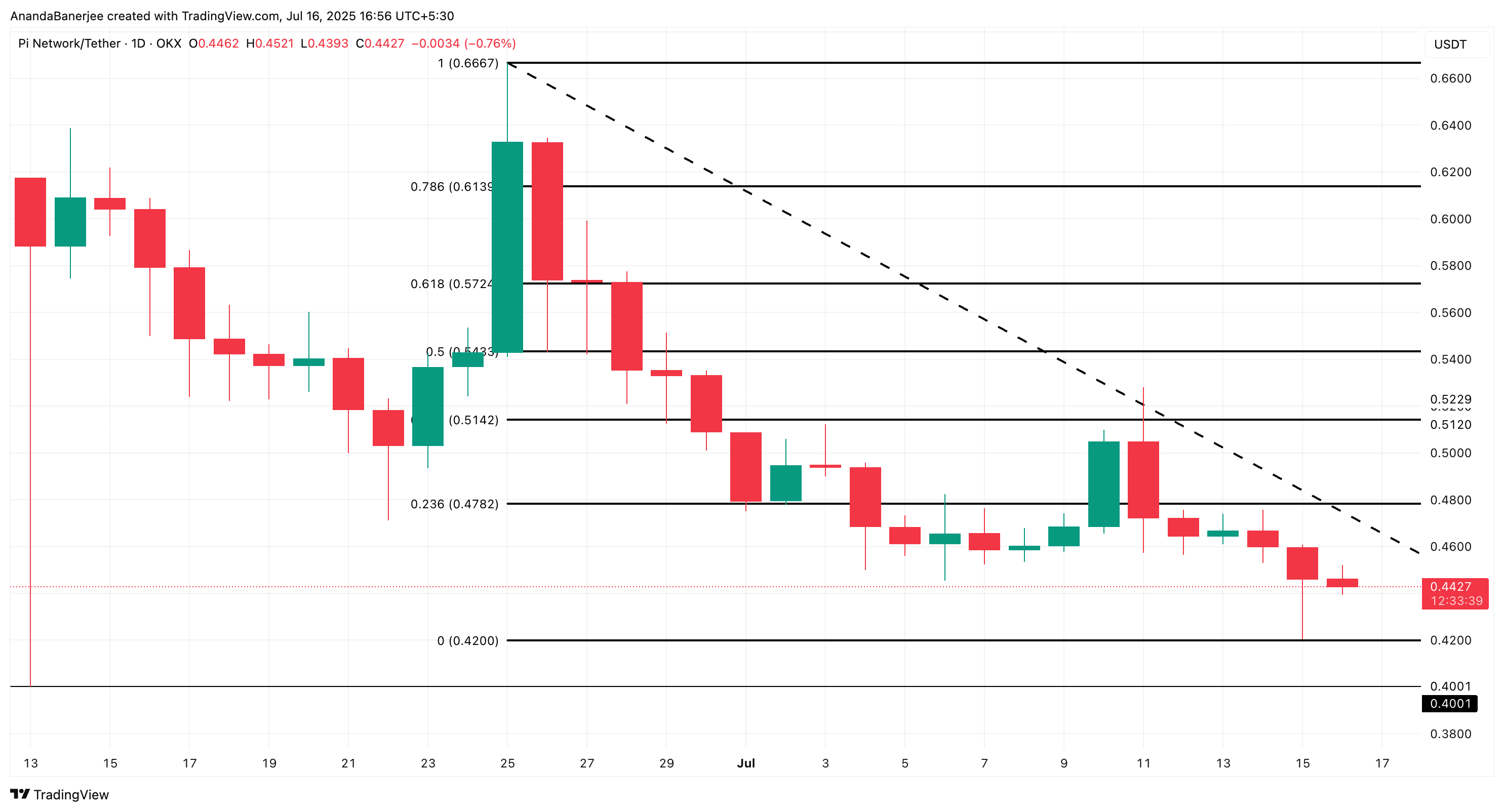 Xét về cấu trúc giá, Pi Coin đã mất mức Fibonacci 0.23 tại 0.47 USD và hiện đang củng cố quanh mức 0.44 USD. Hỗ trợ chính tiếp theo là tại 0.42 USD, và nếu mức này bị phá vỡ, thị trường có thể giảm thêm 10% từ mức hiện tại.