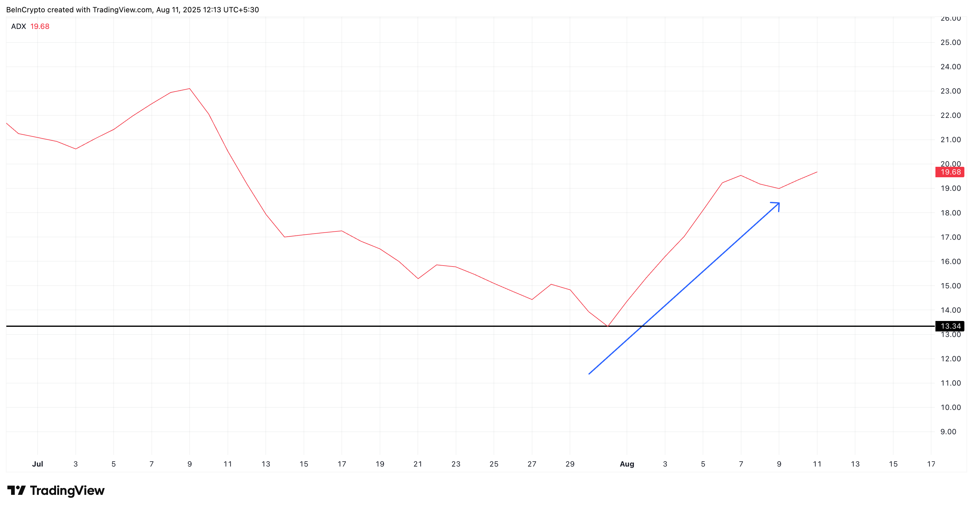 Đối với giá Pi Coin, ADX gần 13.3 vào ngày 31/07/2025, được coi là một xu hướng yếu. Hiện tại, nó đã tăng lên 19.6, cho thấy xu hướng tăng hiện tại đang bắt đầu có sức hút thực sự.