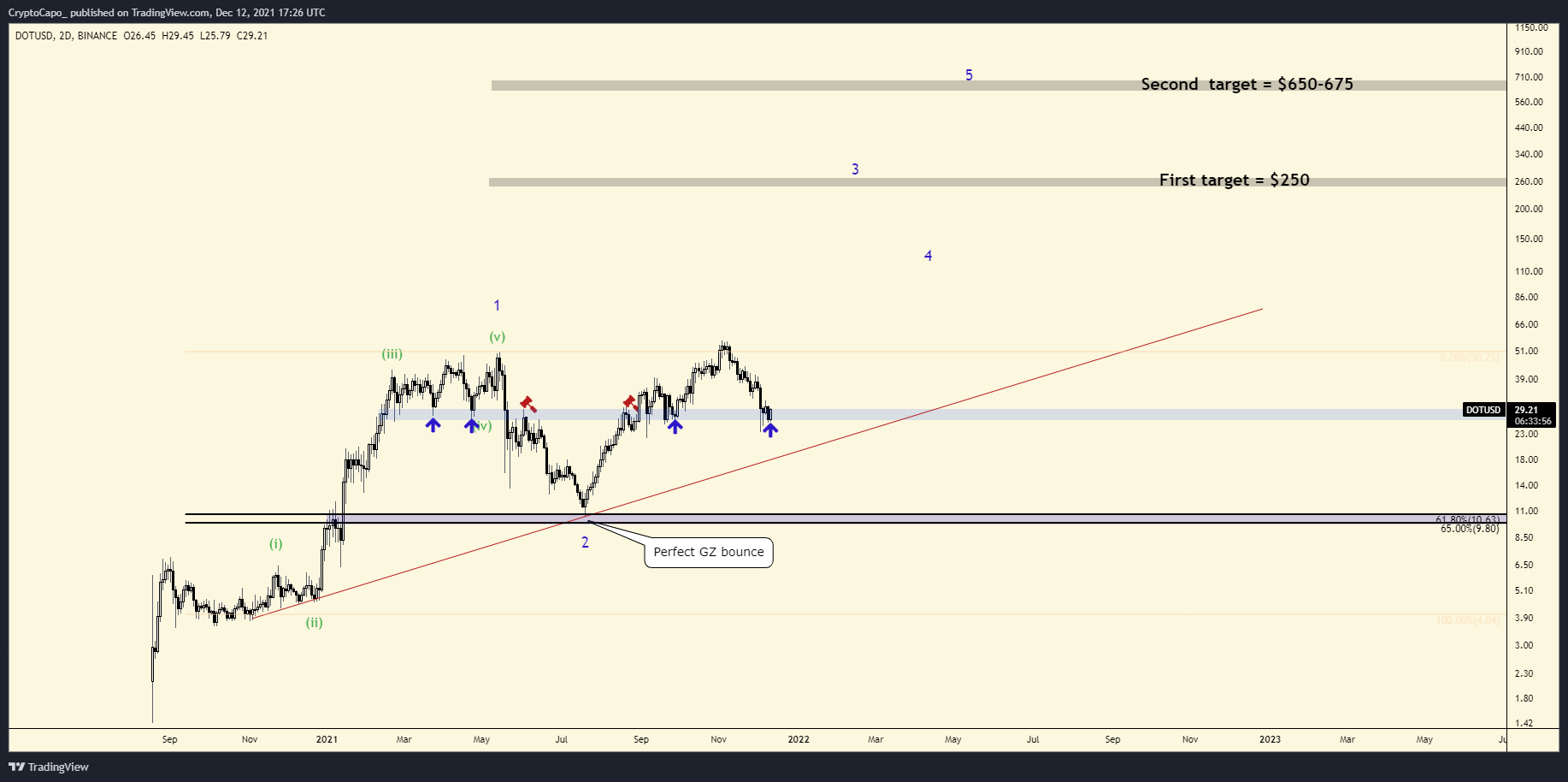 Nhà giao dịch tiền điện tử @CryptoCapo_ đã phân tích biểu đồ giá DOT và nhận định rằng DOT vẫn đang ở trong xu hướng tăng miễn là nó giao dịch trên vùng hỗ trợ 27 USD. Nhận định này cũng tương đồng với những tín hiệu phân tích kỹ thuật ở trên.