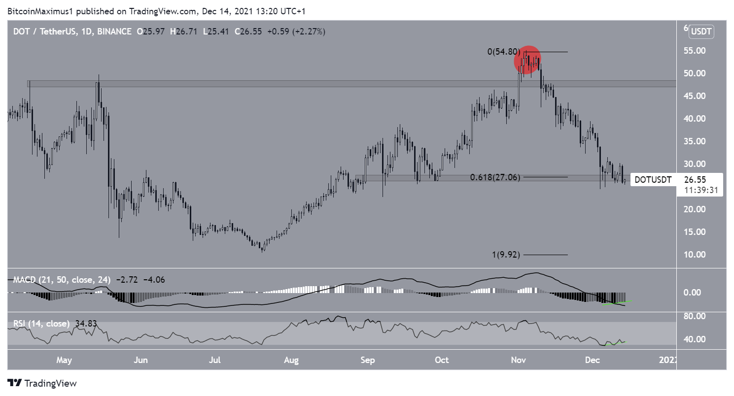 Kể từ ngày 4 tháng 12, Polkadot (DOT) đã giao dịch quanh mức 27 USD. Đây là vùng hỗ trợ quan trọng, vì nó vừa là mức hỗ trợ 0.618 Fib thoái lui vừa là vùng hỗ trợ ngang. Do đó, để có thể tiếp tục xác nhận xu hướng tăng điều quan trọng là DOT phải duy trì được giá trên mức này.