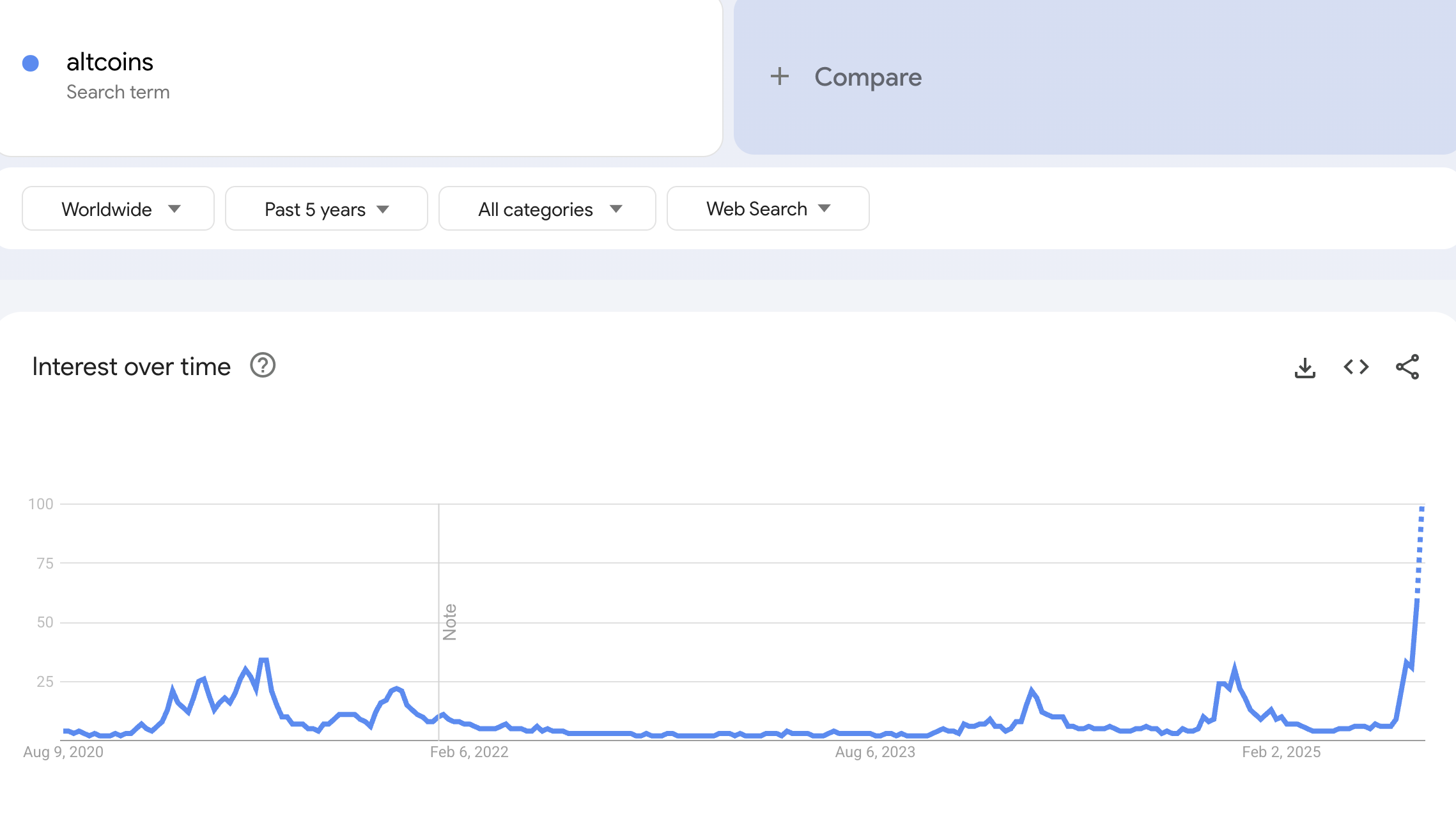 Hiện tại, altcoin đang thu hút sự chú ý của thị trường. Lượng tìm kiếm “altcoin” trên Google Trends đã đạt mức cao kỷ lục.