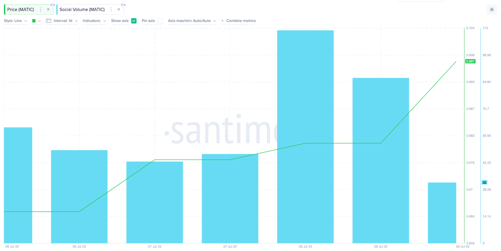 Việc Polygon bổ nhiệm CEO mới dường như đã được đón nhận nồng nhiệt trong cộng đồng. Dữ liệu on-chain do Santiment tổng hợp tiết lộ rằng dự án đã ghi nhận mức tăng đột biến lên đến 120% về Social Volume trong vòng 24 giờ sau khi thông báo được đưa ra. Như minh họa bên dưới, MATIC đã ghi nhận điểm số Social Volume là 90 vào ngày 07/7. Sau khi tin tức được công bố, con số đó ngay lập tức tăng vọt lên 199 vào ngày 08/7.