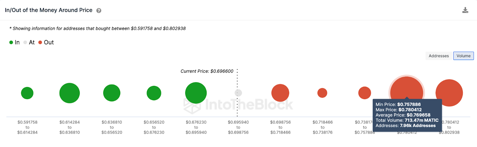 Với 87% người nắm giữ MATIC có khả năng không muốn bán lỗ, nhu cầu tăng đột biến có thể kích hoạt một đợt tăng giá. Dữ liệu IOMAP của IntoTheBlock cho thấy mức 0.75 USD là mức kháng cự đáng kể cản trở MATIC đạt được mục tiêu là 0.8 USD.