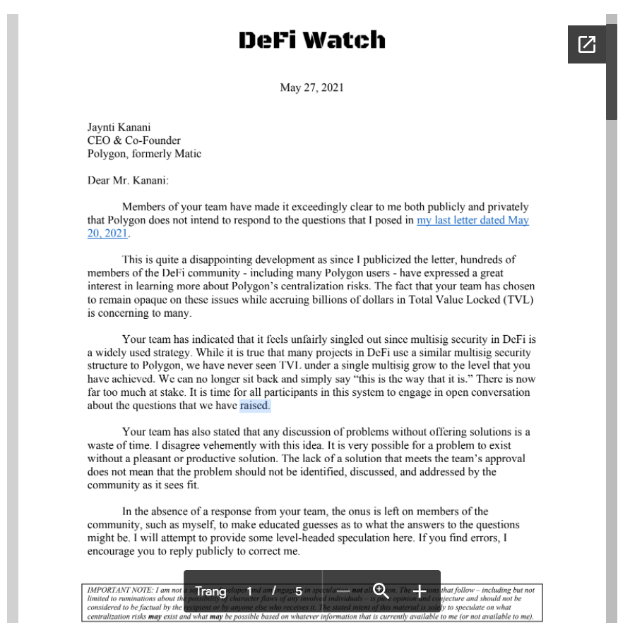 Cùng liên quan đến vấn đề bảo mật, lá thứ thứ hai mà DeFi Watch gửi đến Jaynti Kanani đã thể hiện điều này. Bước thư đầo tiền có lẽ đã gửi đi vào ngày 20/05/2021 nhưng không được Polygon hồi đáp. Ngay đầu lá thư đã thẳng thắn đưa ra vế đề rằng:
