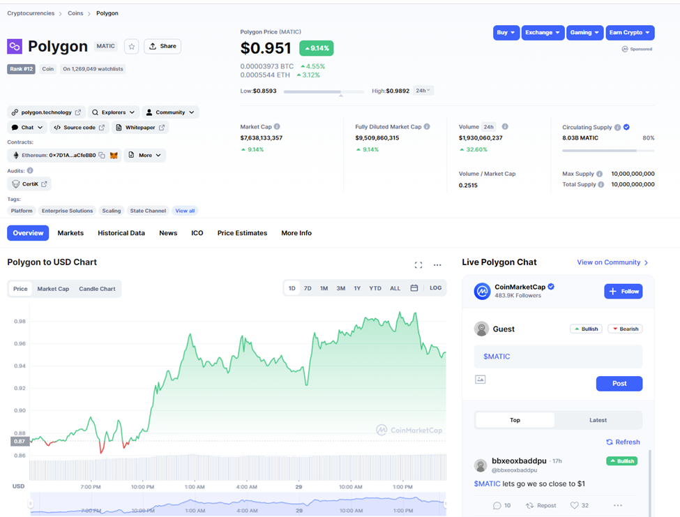Tại thời điểm viết bài, giá MATIC tăng 9.14% trong 24 giờ và giao dịch quanh mức 0.95 USD. Vốn hóa thị trường của MATIC cũng tăng 9.1% ở mức 7.6 tỷ USD. Mức tăng trưởng này củng cố vị trí 12 của MATIC theo bảng xếp hạng vốn hóa của BeInCrypto.