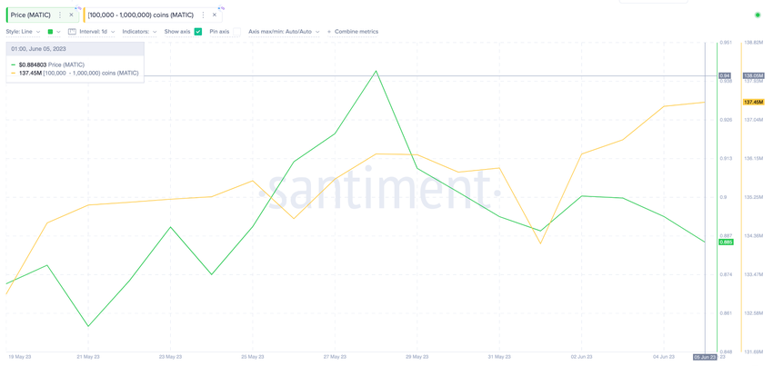 SponsoredTừ ngày 01/6 đến ngày 05/6, những ví cá voi nắm giữ số dư từ 100,000 MATIC đến 1 triệu MATIC đã tích lũy đáng kể. Biểu đồ bên dưới cho thấy cách nhóm này thêm 3.26 triệu MATIC khác vào số dư của mình trong bốn ngày giao dịch vừa qua.