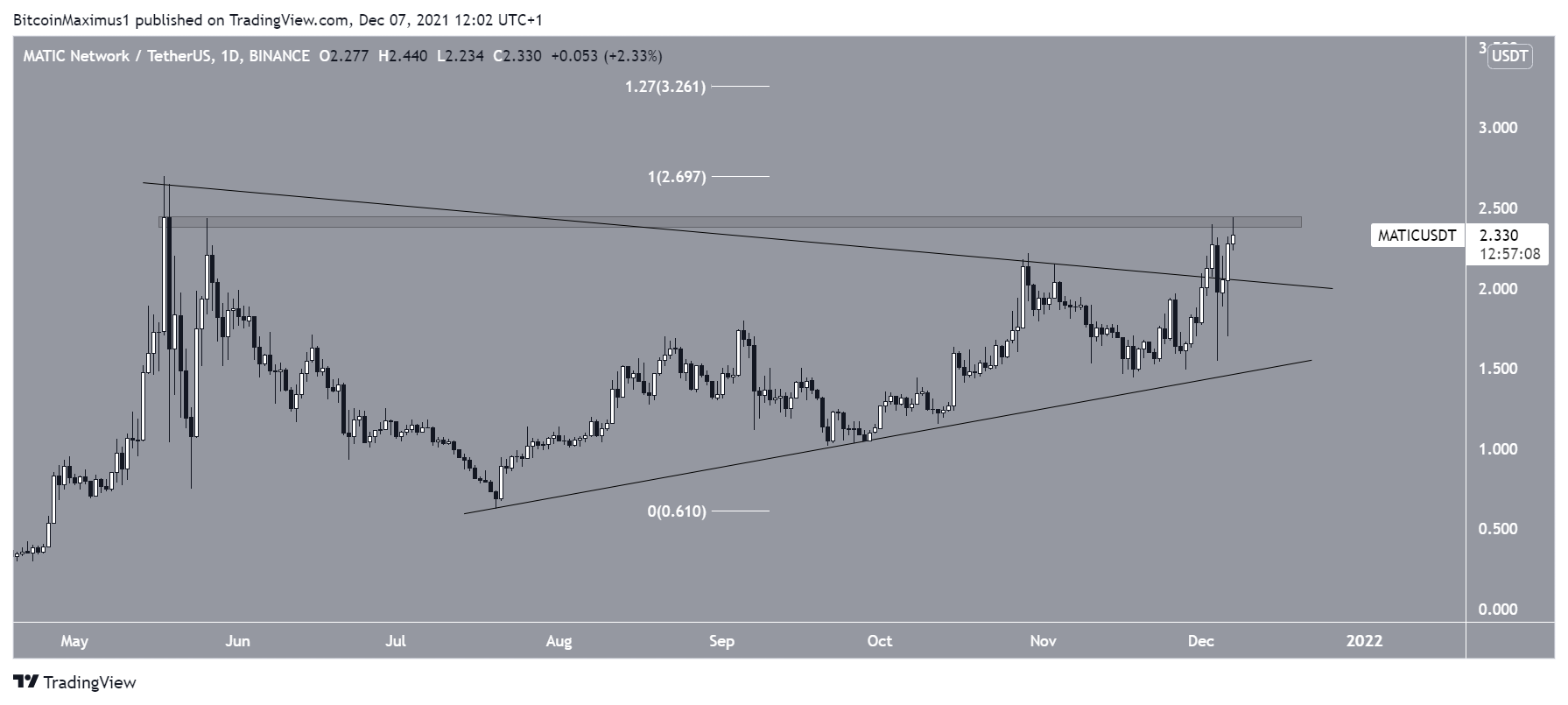 MATIC hiện đang cố gắng vượt lên trên vùng kháng cự 2.40 USD, đây là vùng kháng cự cuối cùng trước khi MATIC bứt phá để thiết lập đỉnh mới.