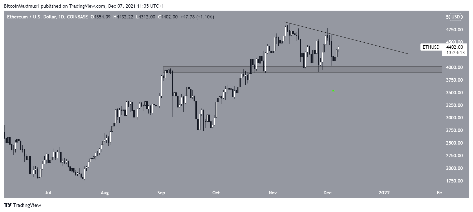 Ethereum (ETH) đã giảm kể từ ngày 10 tháng 11 sau khi đạt mức đỉnh lịch sử tại 4,867 USD. Cũng vào ngày 4 tháng 12, giá ETH đột ngột giảm mạnh về 3,575 USD. Tuy nhiên, giá ETH cũng đã nhanh chóng tăng trở lại về mức trên 4,400 USD.