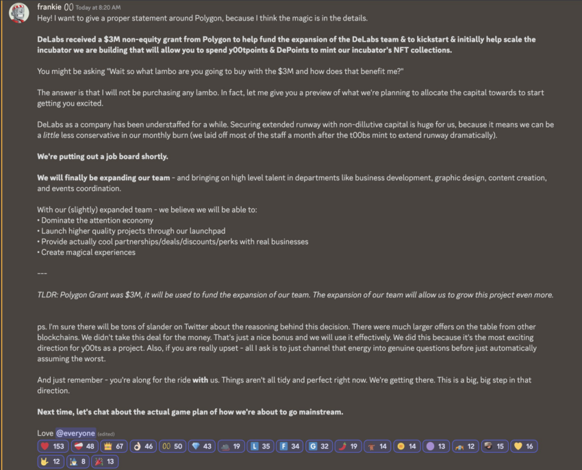 Trong một bài đăng Discord, Frank, trưởng dự án tiết lộ rằng y00t đã nhận được 3 triệu USD dưới dạng tiền trợ cấp không quy đổi vốn chủ sở hữu từ Polygon để chuyển mạng. Trước đó, như BeInCrypto News đã đưa tin hai dự án là DeGod và y00t đã chuyển từ mạng Solana sang Ethereum và Polygon. Khi thông báo được đưa ra vào tháng 12, Frank cho biết việc di chuyển là do các dự án này đã hết hạn trên Solana. Ông nói thêm rằng: