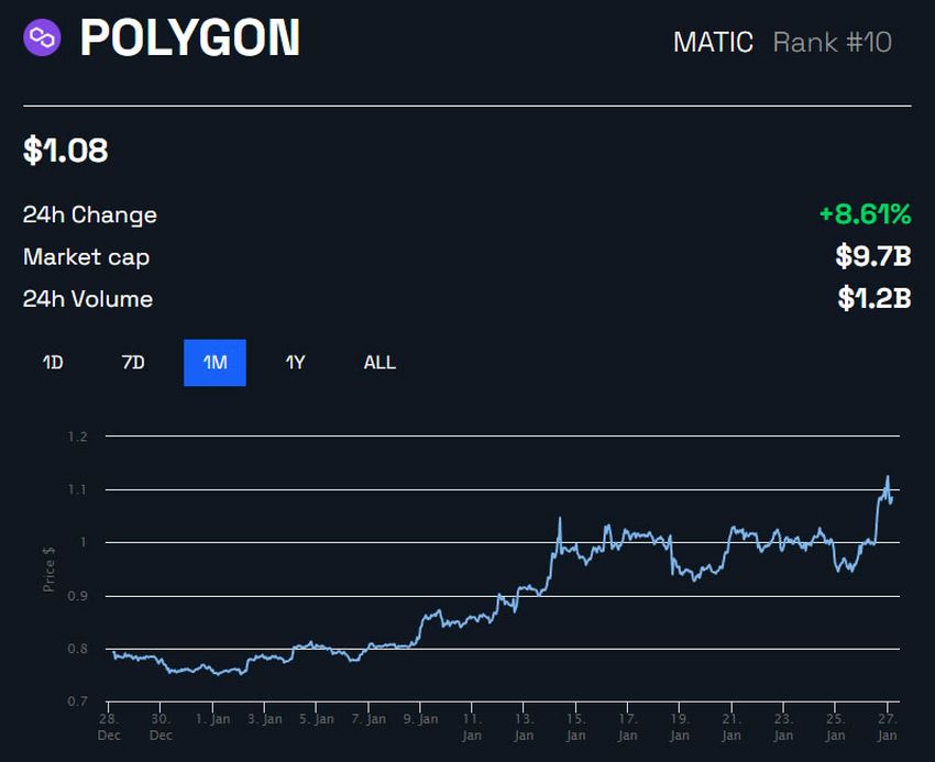 Hoạt động trên chuỗi Polygon tăng đã được phản ánh trong đà tăng giá của MATIC. Do đó, đồng coin này đã tăng 8.7% trong ngày để đạt 1.09 USD vào thời điểm viết bài. Đáng chú ý, MATIC đang đi theo hướng ngược lại với phần còn lại của thị trường tiền điện tử, vốn đã giảm nhẹ trong ngày 27/1.