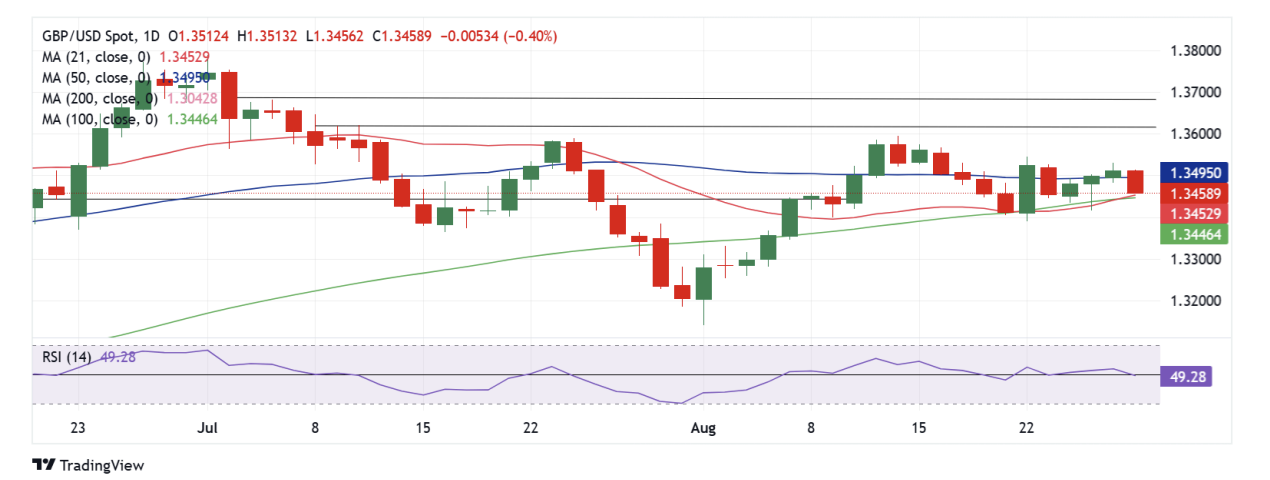 Biểu đồ hàng ngày của GBP/USD cho thấy sự đảo chiều đỉnh kép đã dừng lại tại điểm hội tụ của Đường Trung bình Đơn giản (SMA) 21 ngày và SMA 100 ngày một lần nữa, sau đó ở khoảng 1.3420.