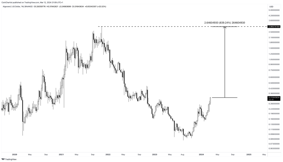 Algorand là một blockchain sử dụng bằng chứng cổ phần (PoS) thuần túy. Nó được thiết kế với khả năng mở rộng, tính an toàn và phi tập trung. Những điều này có thể là một lợi thế hấp dẫn với những người yêu tiền điện tử. Với mức giá hiện tại vào khoảng 0.21 USD, việc trở lại mức cao nhất mọi thời đại của nó là 2.89 USD sẽ mang tương đương mức tăng trưởng đến 1,276%. Với phương pháp tiếp cận đổi mới trong việc đạt được sự đồng thuận của Algorand đã thu hút sự chú ý đáng kể của các nhà đầu tư. Điều này biến nó trở thành một trong những đồng coin tiềm năng trong mùa tăng trưởng này.