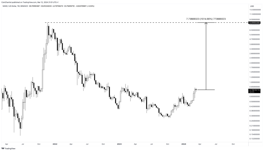 SAND, tiền điện tử gốc của metaverse The Sandbox, mang lại cơ hội hấp dẫn cho nhà đầu tư Việt Nam. Với giá hiện tại là 0.79 USD, việc quay trở lại mức cao nhất mọi thời đại tại 8.49 USD có thể tạo ra lợi nhuận đáng kể 974%. Khi ý tưởng về metaverse tiếp tục thu hút sự chú ý, vai trò của SAND trong việc cung cấp năng lượng cho thế giới ảo này đặt nó vào vị trí là một bên được hưởng lợi từ xu hướng mới nổi này.