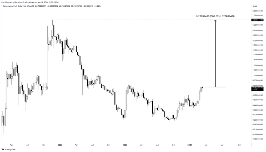 Decentraland, một người chơi nổi bật khác trong lĩnh vực metaverse, mang lại cơ hội đầu tư hấp dẫn cho nhà đầu tư Việt Nam nói riêng. Hiện nó đang được giao dịch ở mức 0.75 USD. Việc giá MANA quay trở lại mức cao nhất mọi thời đại là 5.85 USD có thể mang lại lợi nhuận đáng kể 680%. Khi ý tưởng về metaverse tiếp tục thu hút sự quan tâm của nhà đầu tư, thế giới ảo của Decentraland và token MANA của nó có thể hưởng lợi từ sự hứng thú ngày càng tăng này.
