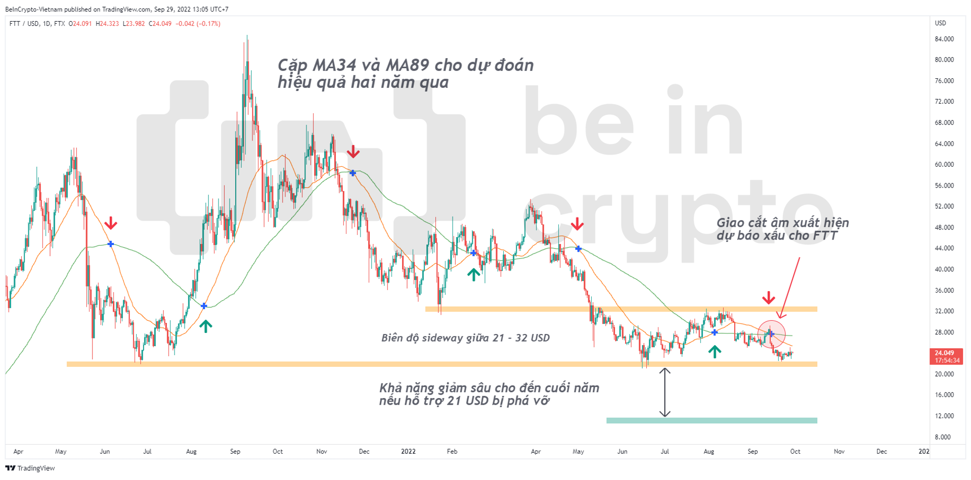 - FTT có thể giảm về hỗ trợ 21 USD (hiện đang rất gần) và tranh chấp tại đây. Biên độ sideway giữa 32 USD – 21 USD sẽ bị phá vỡ và thay thế bằng biên độ sideway mới.