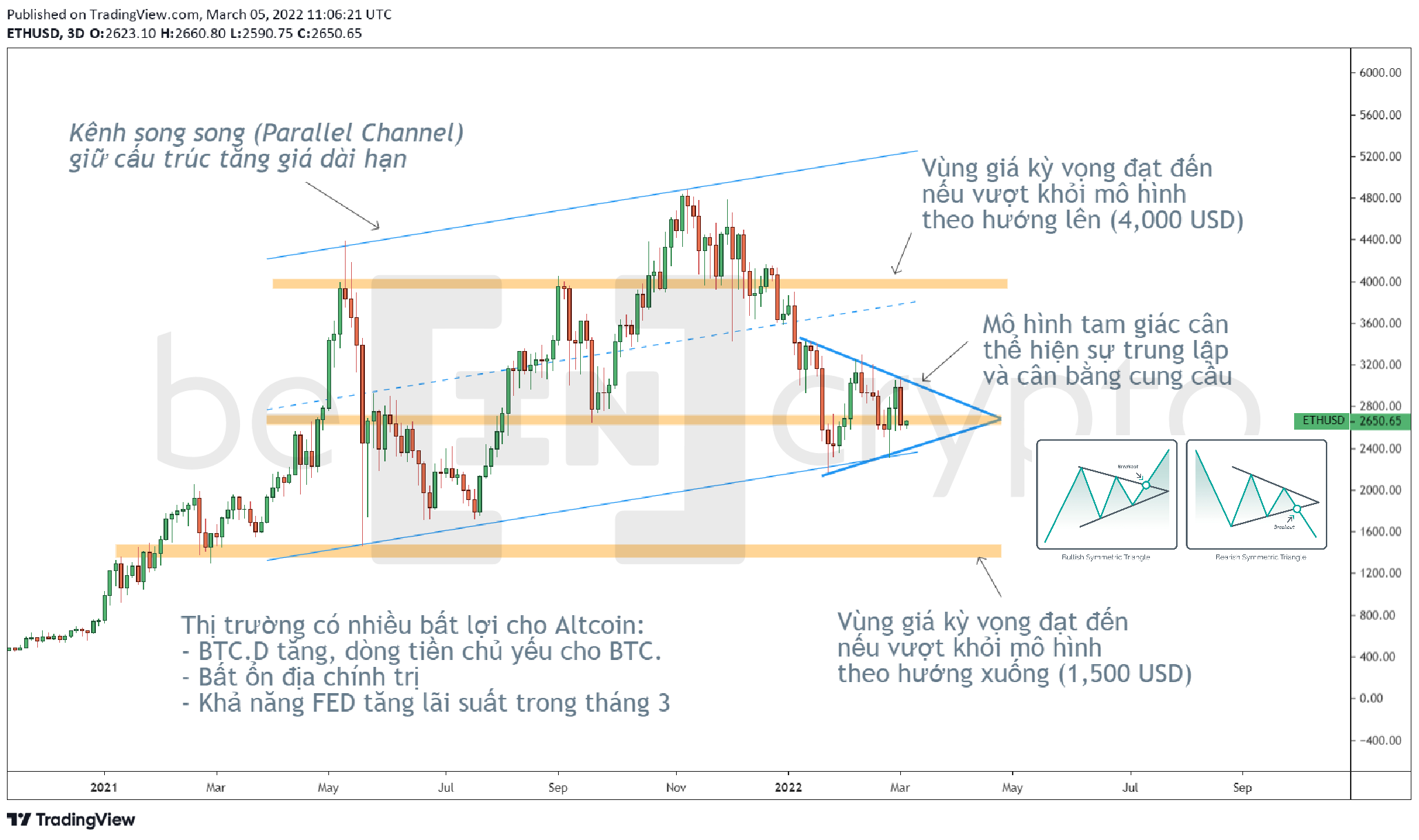 - Mô hình tam giác cân được hình thành từ đầu năm 2022 đến nay có thể định hình xu hướng trung hạn khi giá breakout theo hướng nào. Đây vốn là mô hình trung lập thể hiện sự cân bằng trở lại trong cung cầu sau một đợt biến động thái quá. Mô hình trung lập này được đánh dấu bằng mức giá trung bình là vùng 2,700 USD. Nếu breakout theo hướng lên, chúng ta có thể kỳ vọng ở mức 4,000 USD. Và ngược lại, breakout theo hướng xuống thì ETH có thể chạm 1,500 USD trong vài tháng tới.