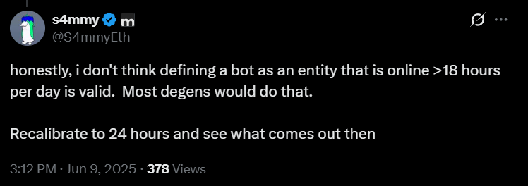 Cụ thể, Adam cho rằng bất kỳ nhà giao dịch nào trên Pump.fun hoạt động hơn 18 giờ mỗi ngày đều là bot. Anh ấy cho biết rằng việc lọc kết quả rất khó khăn, vì một số nhà giao dịch là con người hàng đầu trung bình hoạt động 16 giờ mỗi ngày.