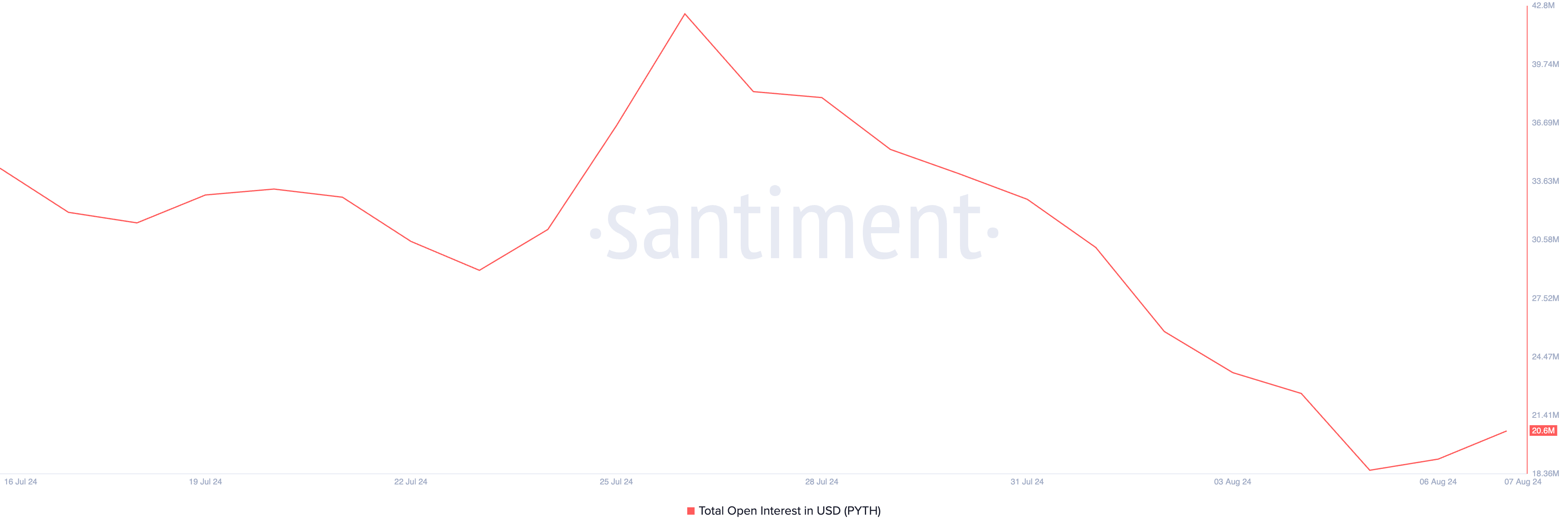 PYTH, token của nhà cung cấp dịch vụ oracle Pyth Network, đã chứng kiến sự sụt giảm đáng kể trên thị trường phái sinh của mình. Tổng khối lượng hợp đồng mở (OI) đã giảm xuống mức thấp nhất từ trước đến nay.